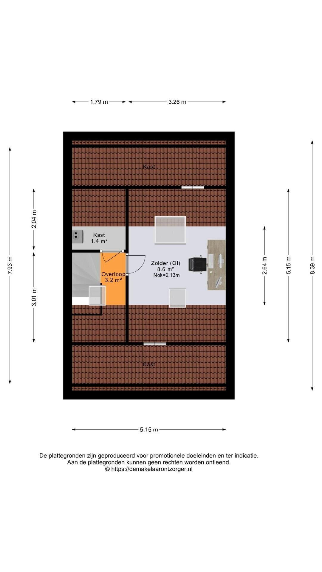 Zolderkamer van ca. 9 m²;